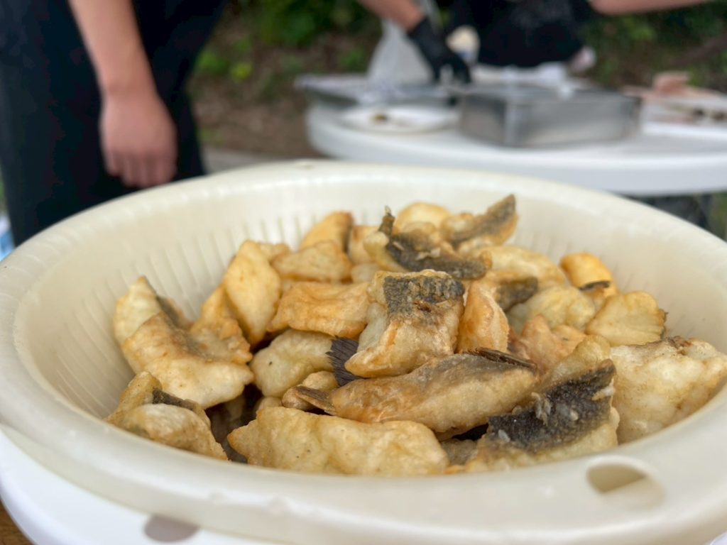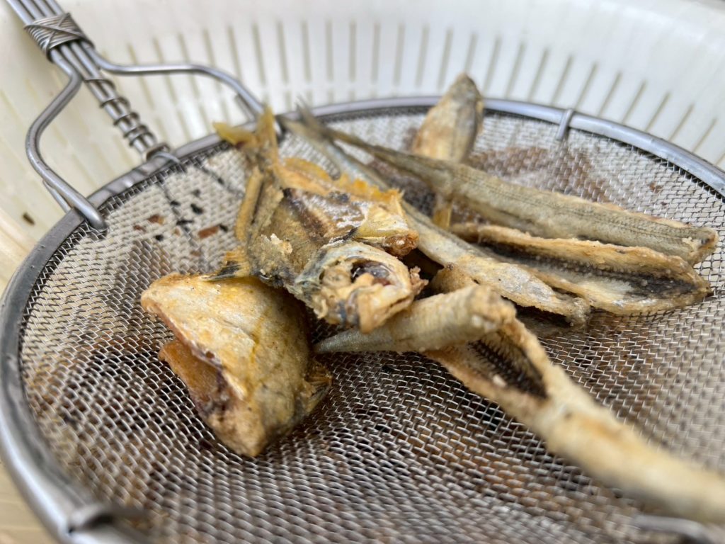 釣った魚はその場でさばいて唐揚げにして食べていただきました。